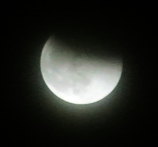 風邪気味で早めの帰宅。ベランダから望む東方・仰角15度辺りは薄雲でボケ気味でしたが、月食後半に雲の切れ目から影から抜けていく月を観察できた。