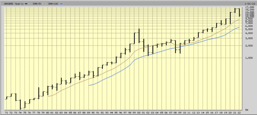 構成銘柄や出来高を無視したNasdaq指数50年間グラフと併せてグラフを見ていただきたい。リスクアセスメントにおいて災害・戦争の頻度を数十年に一度と設定すると、NASDAQは例外局面に立たされているかもしれない。