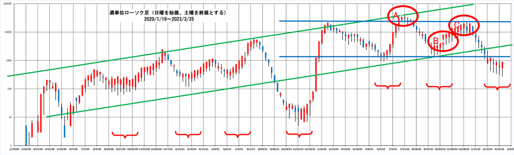 東京コロナ新規感染者推移が三尊天井を形成したことを既にアップしているが、実測値は2年前の水準であり大幅下落を実現している。チャートで見れば下髭陽線が連続し反騰の兆しもあるが、週間レンジはまだ下である。2年前から当サイトで述べているが、欲望の坩堝である株式のベーシックな分析で感染症を語れてしまうことが実に面白い。グラフを株価チャートに見立てれば、ピークのA近辺の「大商い」での買い(L)ポジションは、加熱の冷却で損失を抱える。ボトム局面のBで「ナンピン買い」をして反騰局面のCで戻り売りが大方なのだが、大概はピークAの出来高が大きく大きな下降トレンドに向かう。・・・コロナ新規感染自体は損得対象外なのだがね。