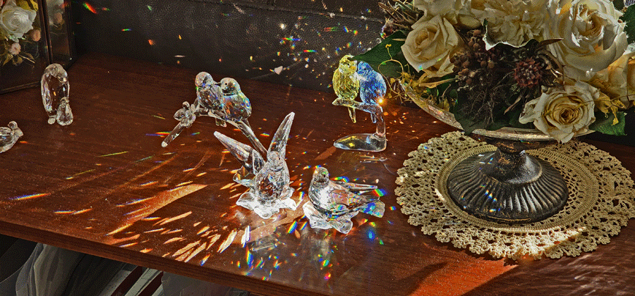 朝方、リビングに低めの日光が入るとガラス細工が分光器になって賑やか。